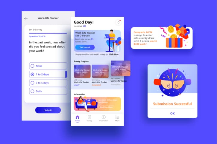 For questions in the app, we developed different question formats based on the nature of the questions to make the app as simple and user-friendly as possible to encourage survey completion. Users are also able to track their survey progress, serving as a reminder for them to complete any pending surveys. They can also view the overall summary results and gain interesting insights on other users' responses.